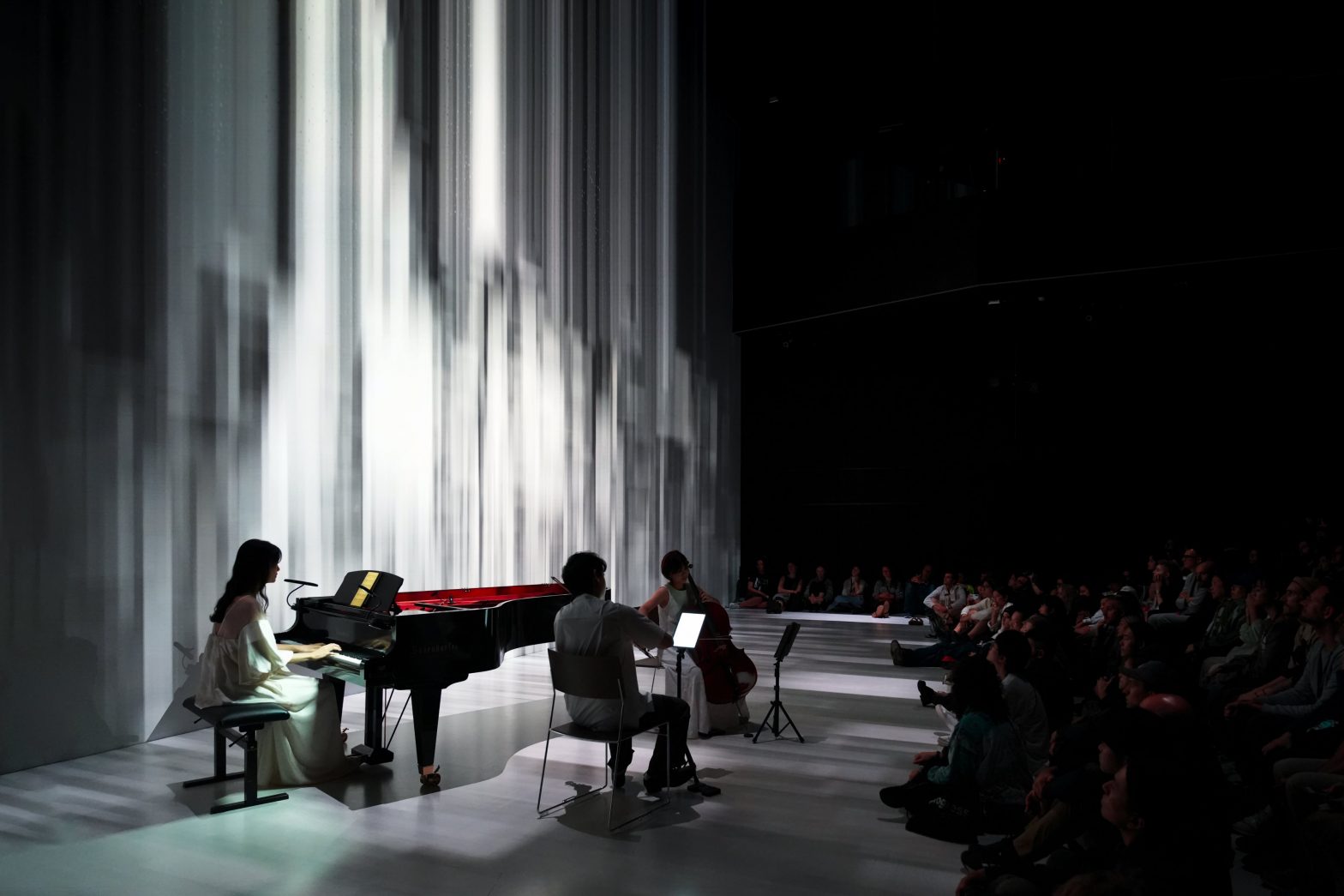 叁式團隊為音樂賦予更概念性的表現,透過分析演奏的頻譜、音高、聲音強度,以及十二音階能量分布,將聲音特徵轉換成畫面流動、變形或顏色變化,並設計與曲目概念相應的段落,讓聲音與影像同步生成、彼此牽引。