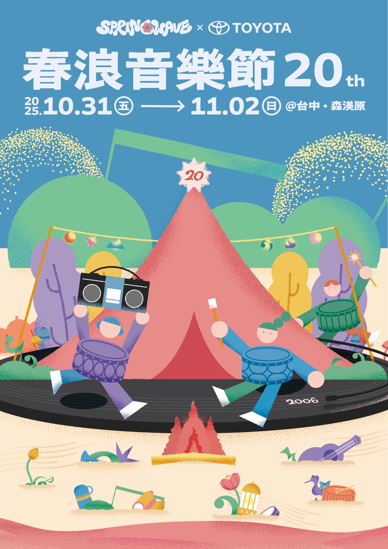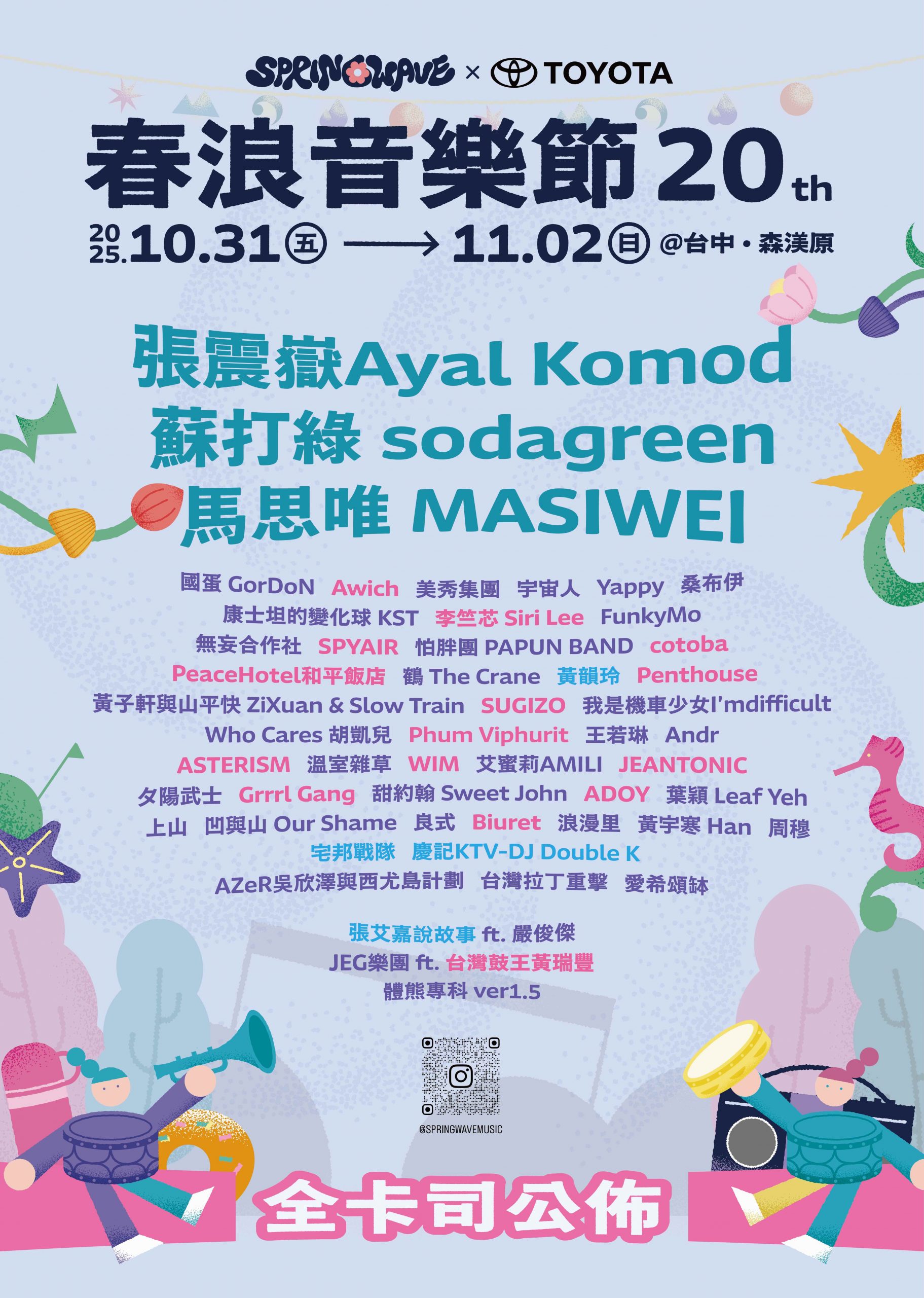 2025 春浪音樂節迎來 20 周年重要里程碑,本次由 TOYOTA 冠名贊助,將於 10 月 31 日至 11 月 2 日台中森渼原盛大舉行。春浪以「最療癒音樂節」為願景,完整卡司陣容正式揭曉,最終演出壓軸名單再次帶來跨世代與跨領域的驚喜組合!