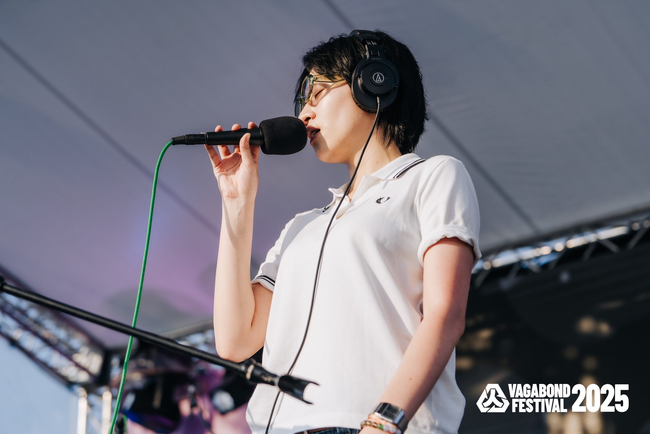 午後,陳嫺靜戴著耳罩式耳機登場,在烈日之下仍神情專注。她緩慢而鬆軟的歌聲,如薄雲般為午後降溫;另一頭金鶴廳則被日本女子搖滾樂團 Haku. 的猛烈鼓點與銳利吉他掀翻。