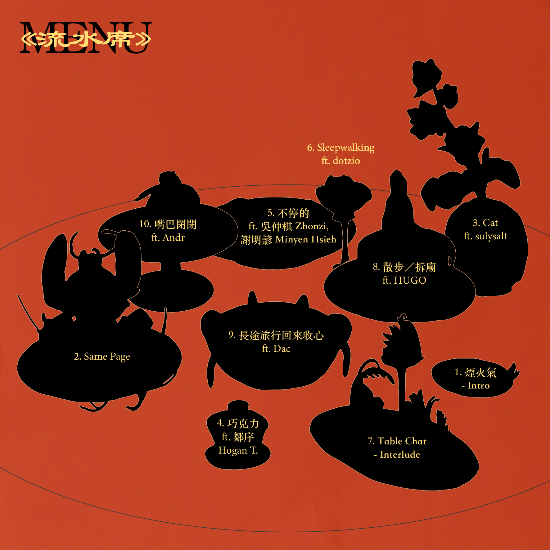 蹲低再跳高、吃飽才起跑,Flowstrong 的音樂養成,來自他多年來作為音樂圈諸多好手的捉刀人,那善於傾聽的耳朵。近年他穿梭在台灣各式音樂場景,與 LEO37、陳嫺靜、我是機車少女、Robot Swing、someshiit 山姆、鄒序等音樂人密切合作,也是嘻哈團體 That’s My Shhh 的核心班底。這些合作經驗累積成《流水席》的底氣——他一手包辦專輯編曲、製作與混音,以製作人視角貫穿全作,讓每首歌都能自己說故事。