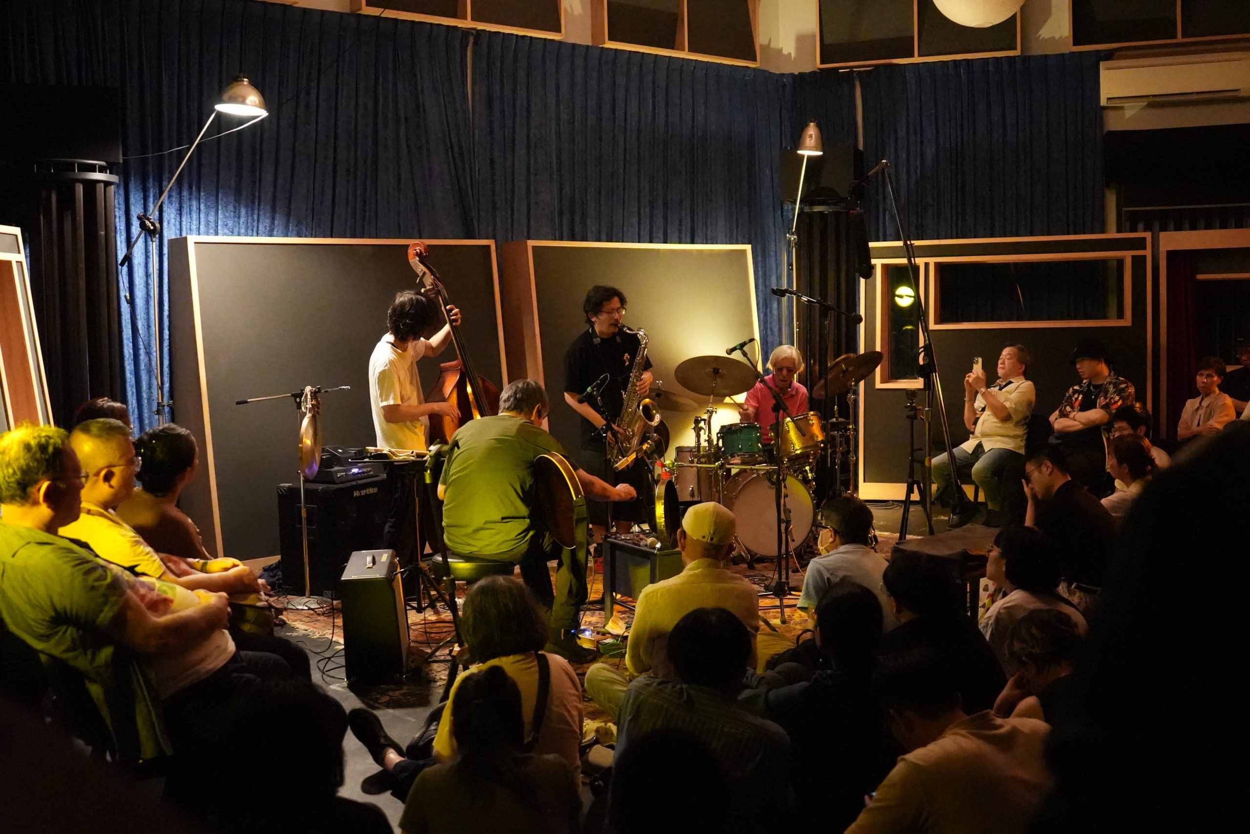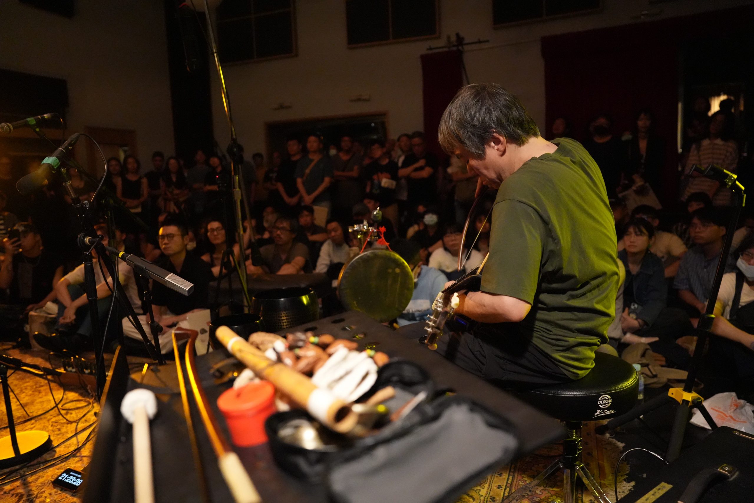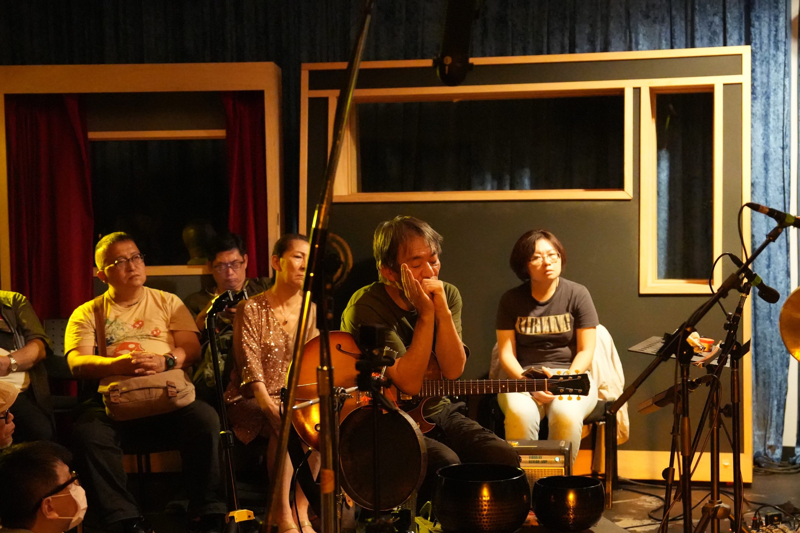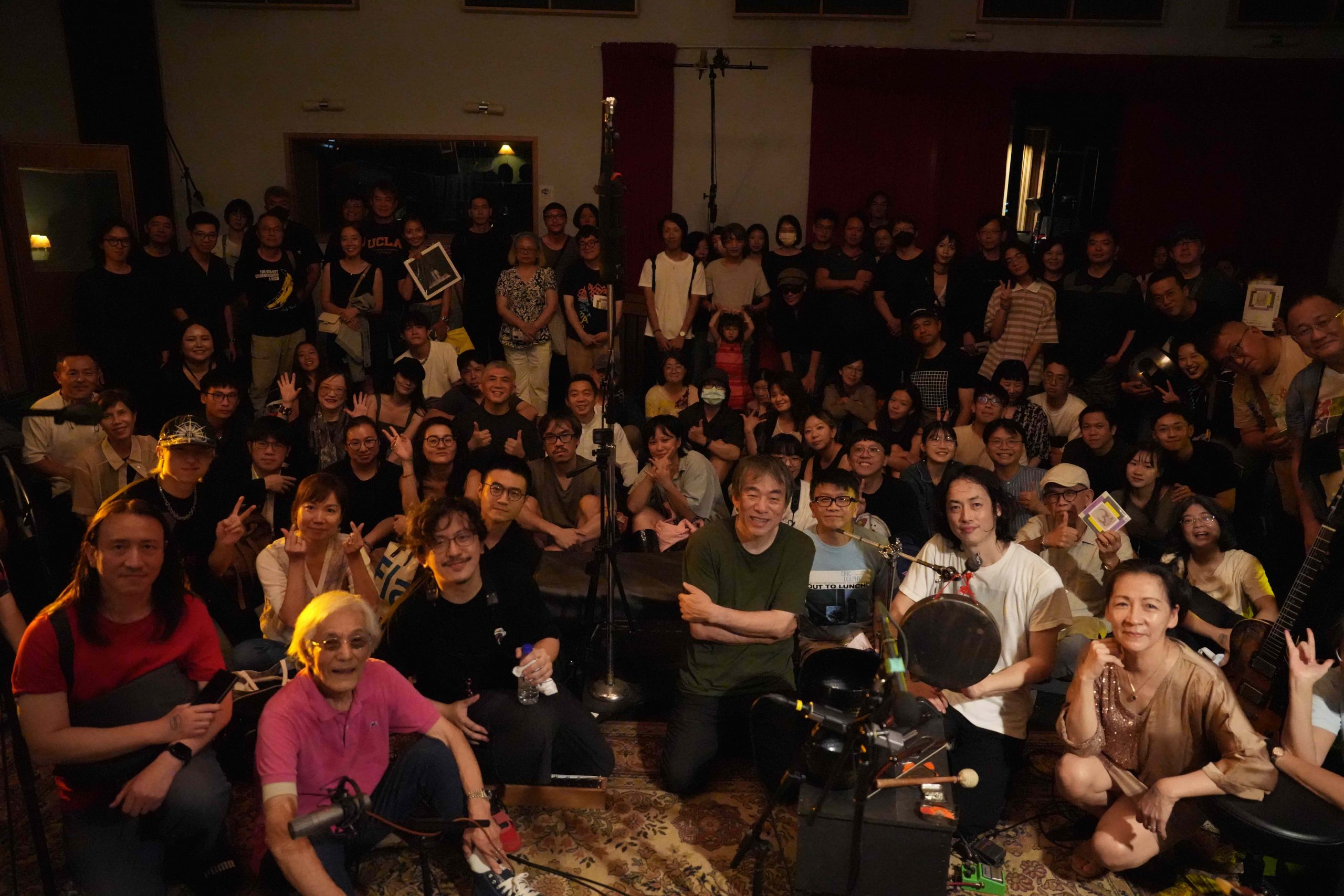 台灣巡演最終場玉成戲院錄音室,我進門之後靠在左側收銀櫃檯前,花了一些時間才意識到左邊的老者就是 7 年不見的大友良英,上一回集結亞際眾多實驗音樂人的 Asian Meeting Festival 在中山堂演出已經是 2018 年,當時有幸和大旺一起訪問他。相比當年,如今大友良英的頭髮更灰白了,兩眼卻依然炯炯有神。