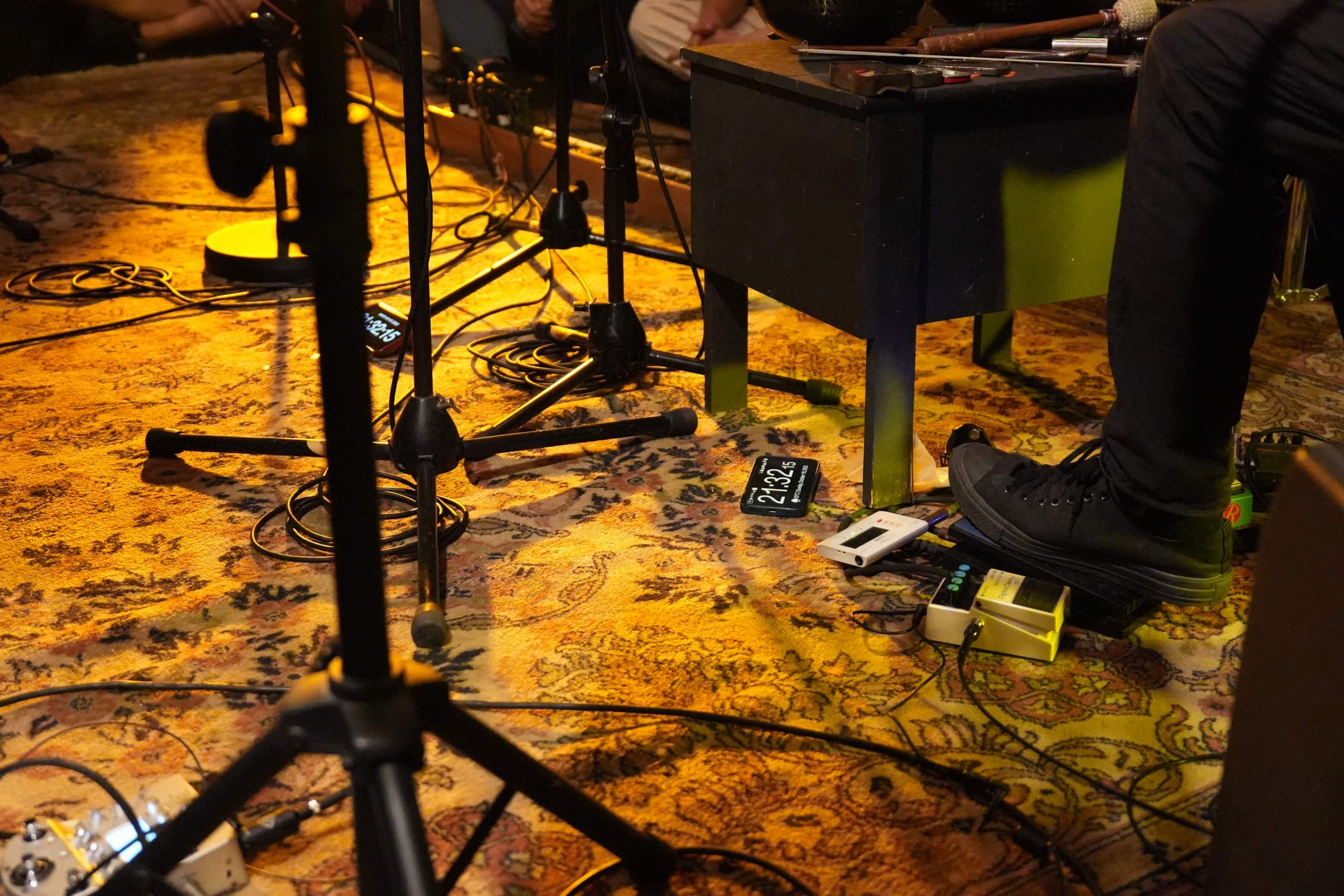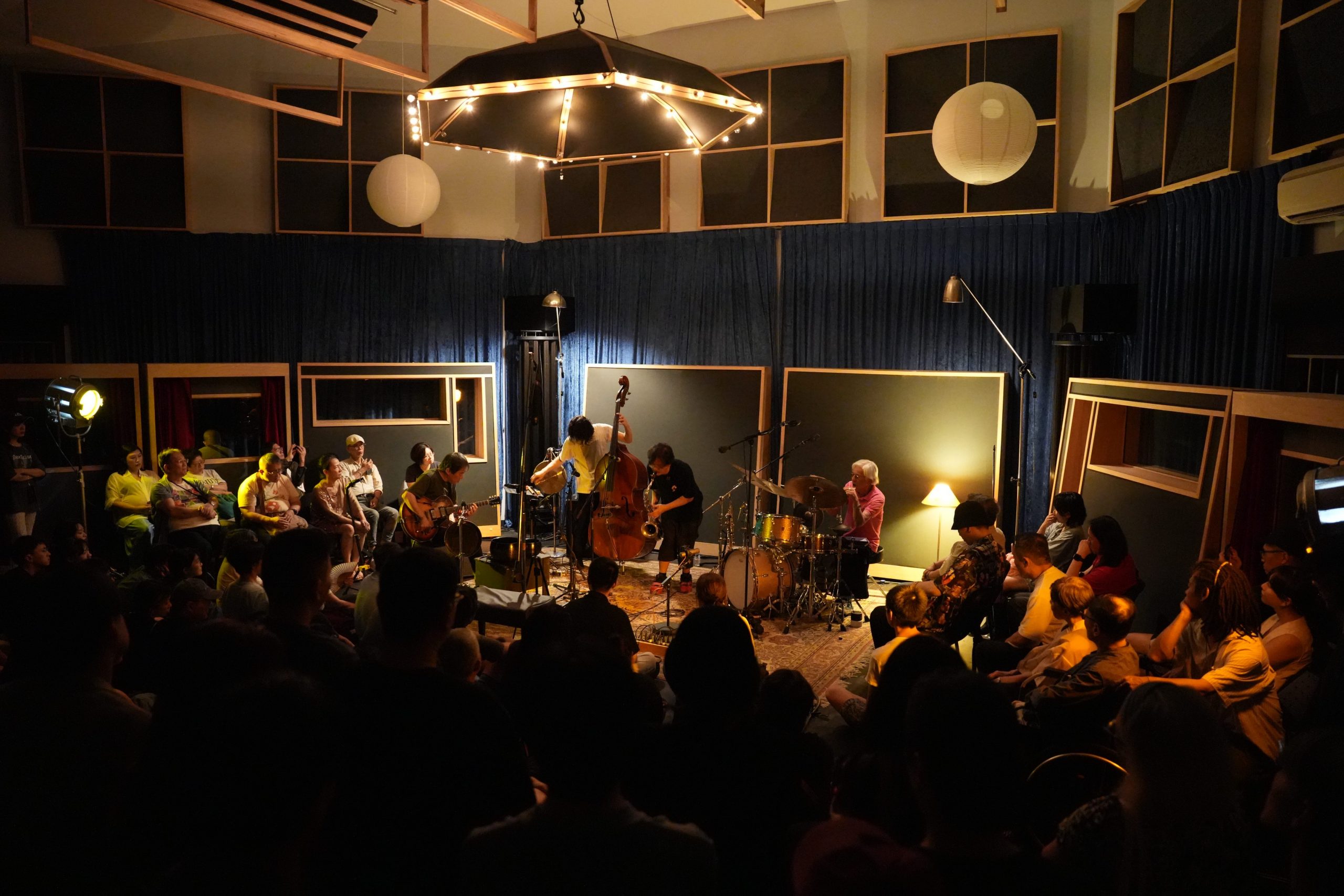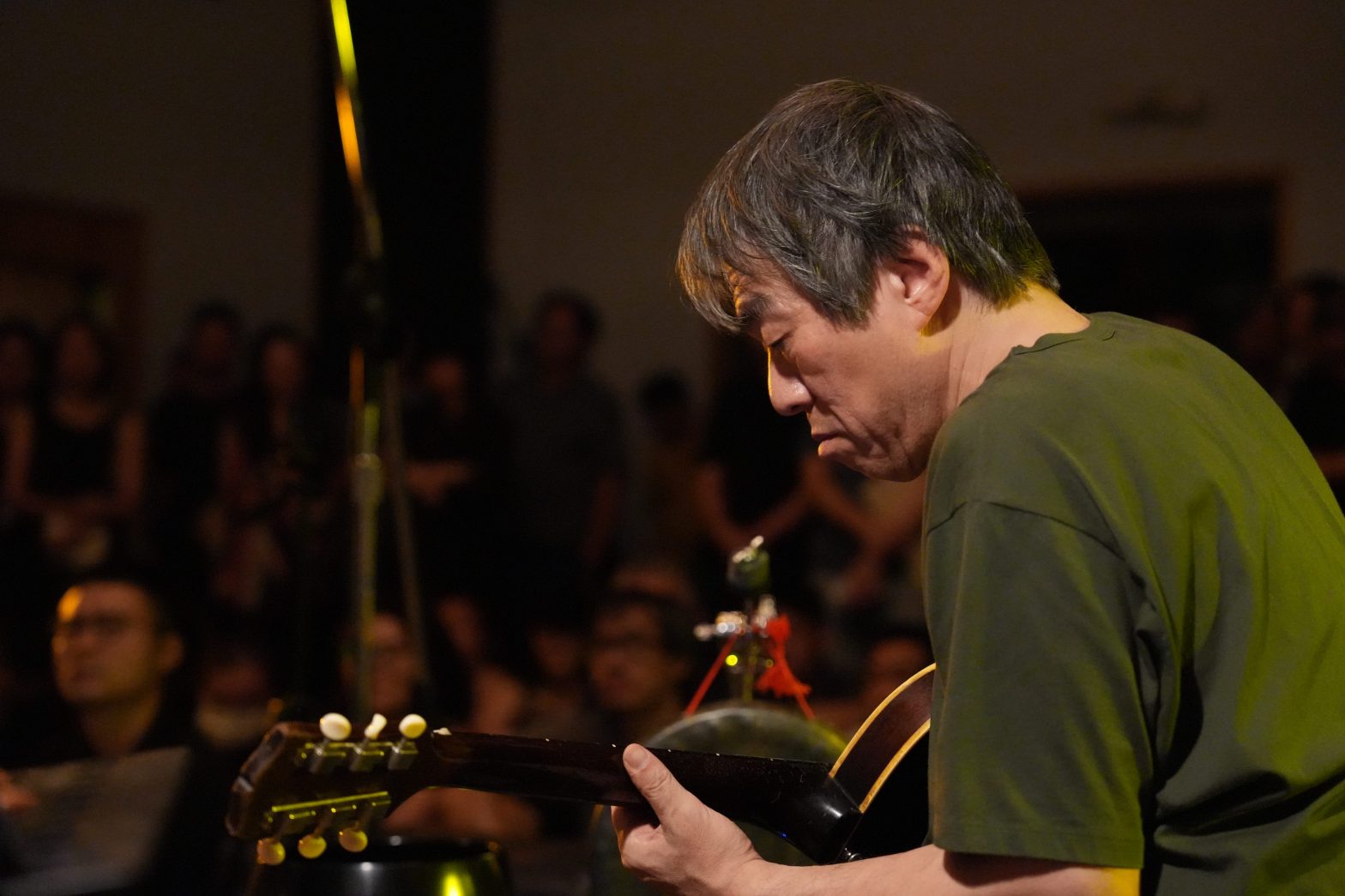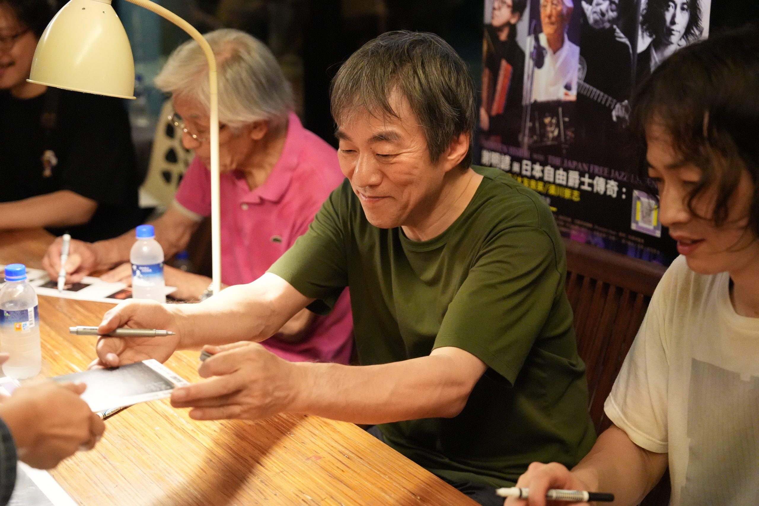 台灣巡演最終場玉成戲院錄音室,我進門之後靠在左側收銀櫃檯前,花了一些時間才意識到左邊的老者就是 7 年不見的大友良英,上一回集結亞際眾多實驗音樂人的 Asian Meeting Festival 在中山堂演出已經是 2018 年,當時有幸和大旺一起訪問他。相比當年,如今大友良英的頭髮更灰白了,兩眼卻依然炯炯有神。