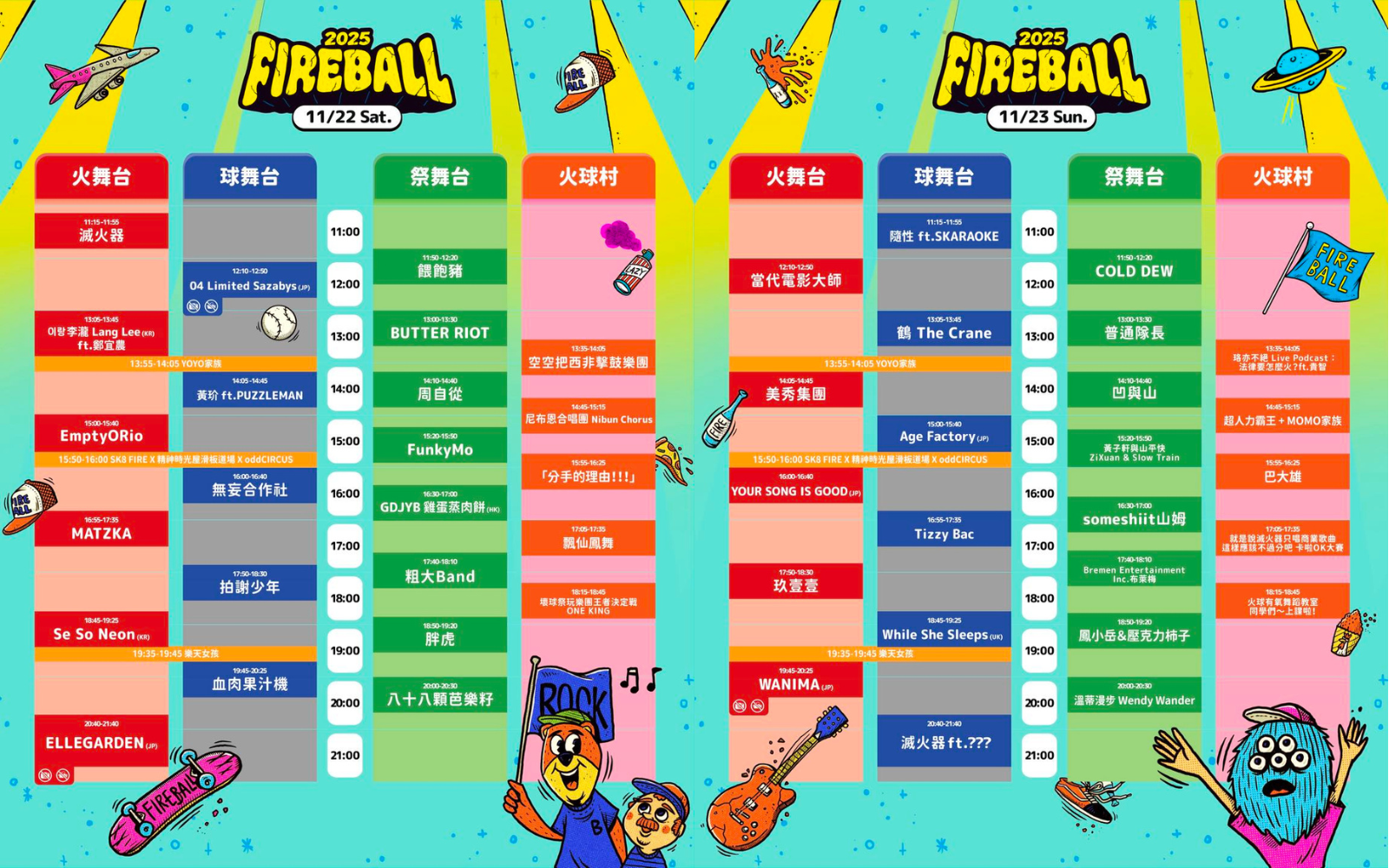 今年的演出陣容同樣火力全開,包括演唱航海王劇場版主題曲〈GONG〉的日本龐克樂團 WANIMA、睽違 7 年再度來台的 04 Limited Sazabys,及精彩的火球限定演出韓國唱作人李瀧將攜手鄭宜農登台,首次蒞臨火球祭的黃玠也邀約 PUZZLEMAN 同台,滅火器在煙火前的壓軸演出也有還未公布的神秘嘉賓。