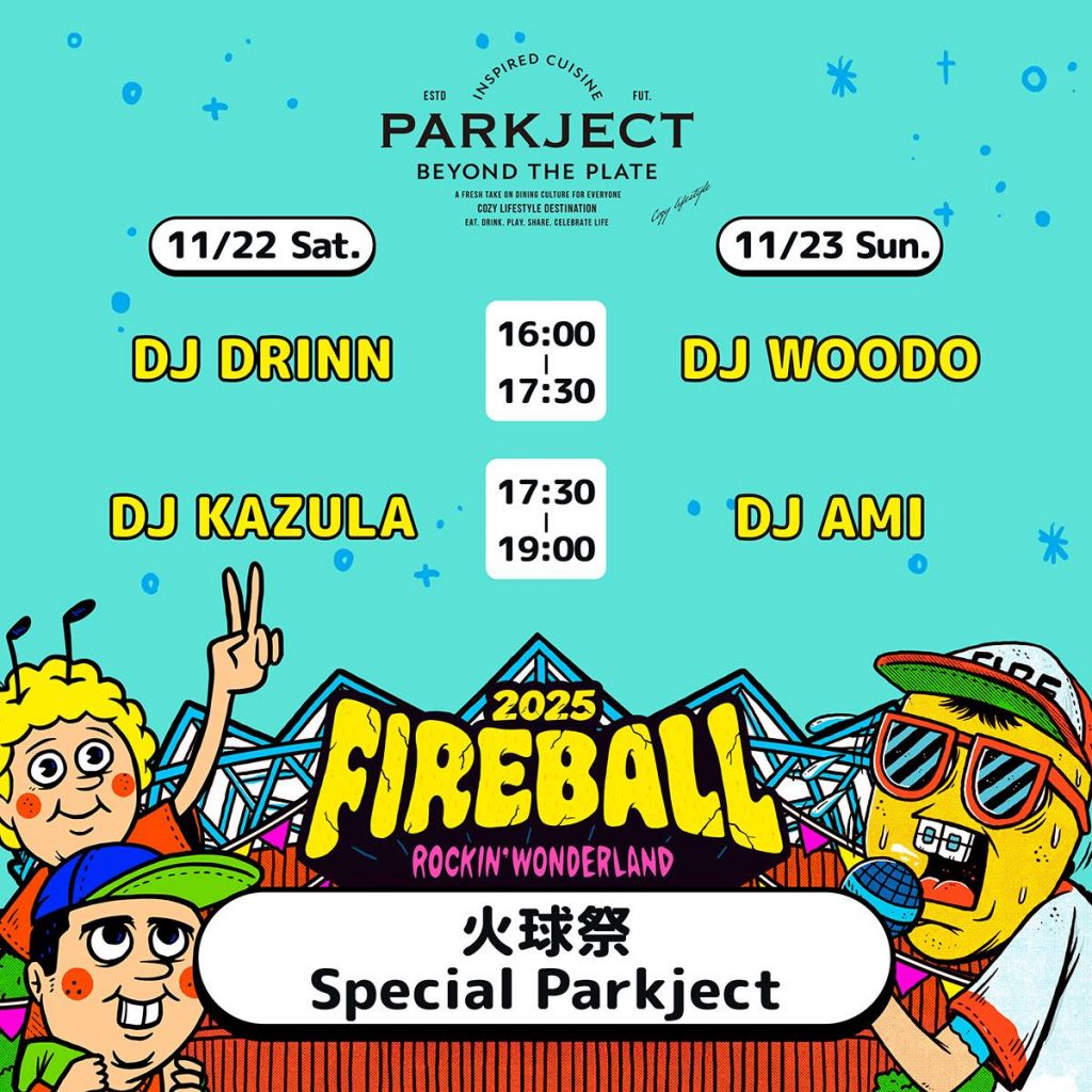 職棒進入休賽季,而球場的進化才剛剛開始。桃園棒球場周邊的全新餐酒館 Parkject 將和 2025 火球祭同步開幕,Parkject 也將成為音樂節延伸的場域,佈置成小型 DJ 舞台,邀請 DJ DRINN、 DJ KAZULA、 DJ WOODO、 DJ AMI 四位輪番上陣。