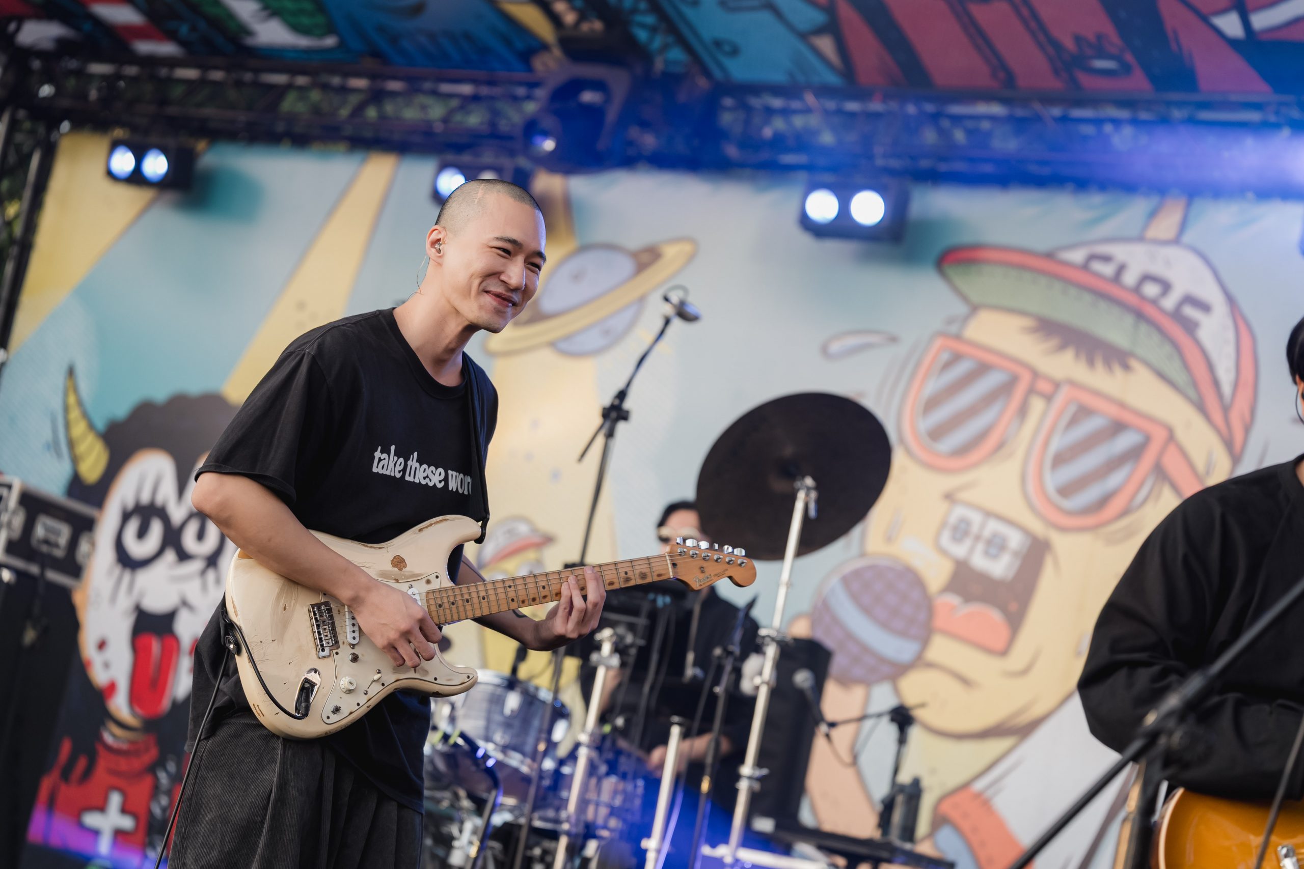 在深藍色的光暈下,SE SO NEON 主唱昭允時而刷弦歌唱,時而抱著吉他搖動身軀,強大的魅力被譽為「吉他惡魔」;馬尾、眼鏡造型也讓不少人聯想到《進擊的巨人》裡的人氣角色漢吉。