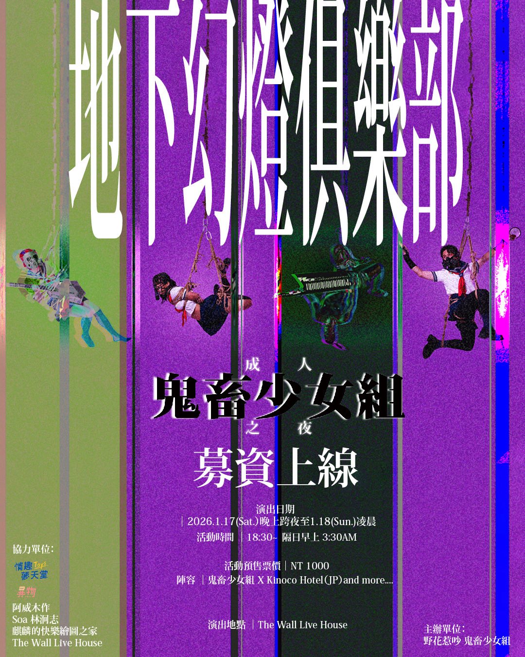近期,他們在群眾募資平台 flyingV 發起名為「地下幻燈俱樂部」的計畫,提供各式的贊助計畫。目標在 2026 年 1 月 17 日在 The Wall 舉辦結合 BDSM 繩縛的成人藝術音樂節。