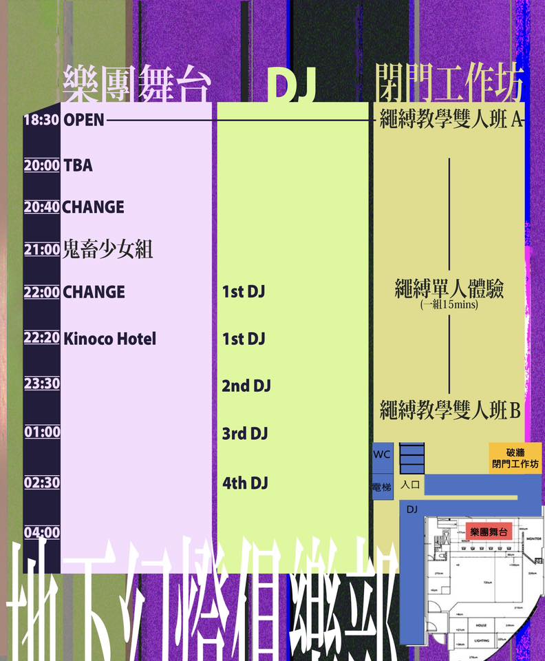 「地下幻燈俱樂部」將以 BDSM 文化與音樂為核心,演出陣容除了鬼畜少女組,還有來自東京的 4 人女子樂團 Kinoco Hotel,由主唱兼鍵盤手 Marianne Shinonome 領軍,融合了六O年代的破音吉他、龐克、新浪潮、迷幻車庫,以及令人上癮的節奏元素。