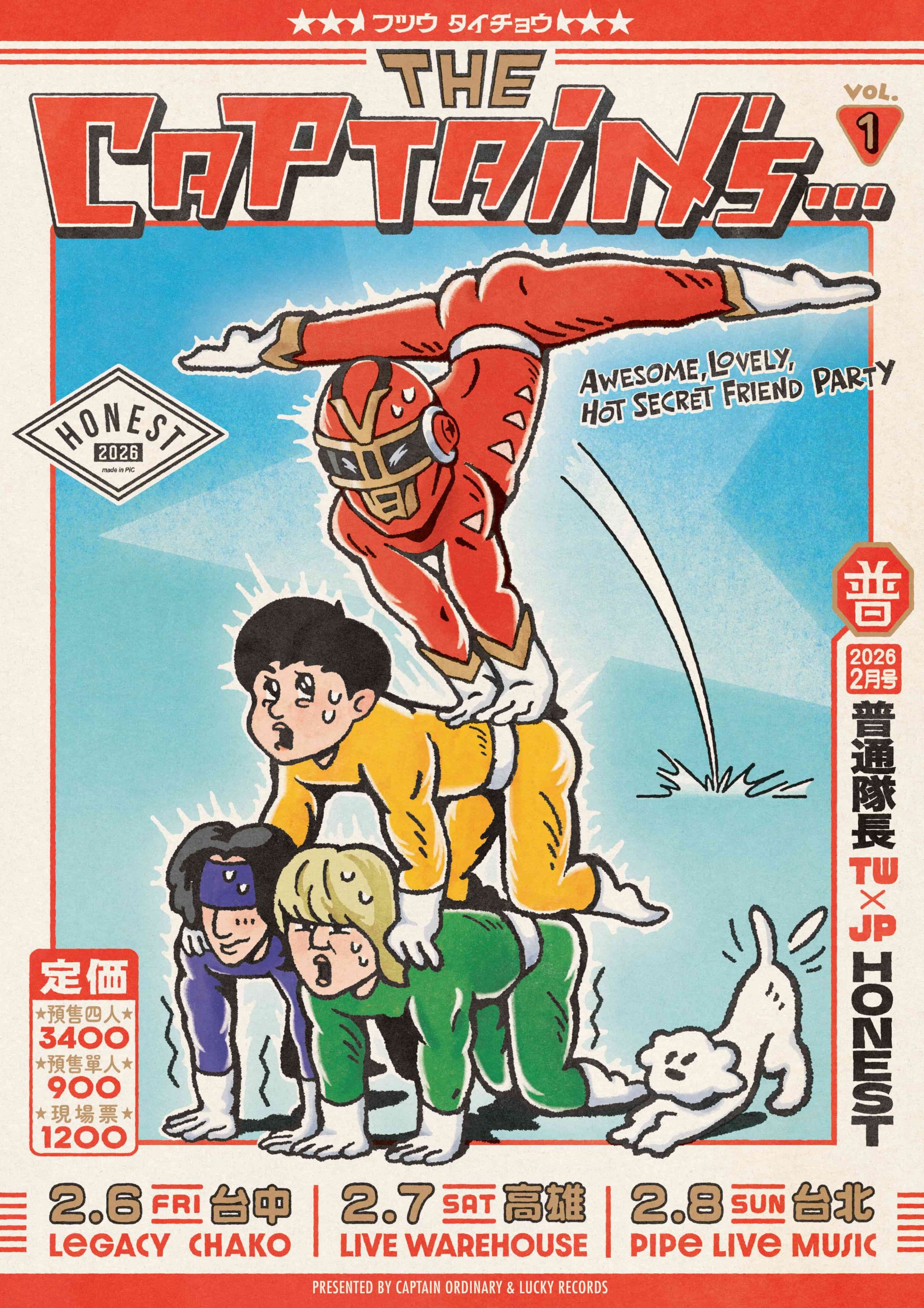 此次由普通隊長發起的《THE CAPTAIN’s…》Vol.1,便是兩支橫跨台日、同屬新世代且同樣相信現場價值的旋律龐克樂團的首次合體。從名古屋舞台開始,這段旅程在台灣延續;2026 年 2 月,普通隊長與 HONEST 將以「”Awesome, Lovely, Hot Secret Friend Party”」為名,啟程展開台中、高雄、台北三城巡迴,邀請所有準備好集合的普通隊員、龐克愛好者,一起加入這場屬於新世代的熱血航程。