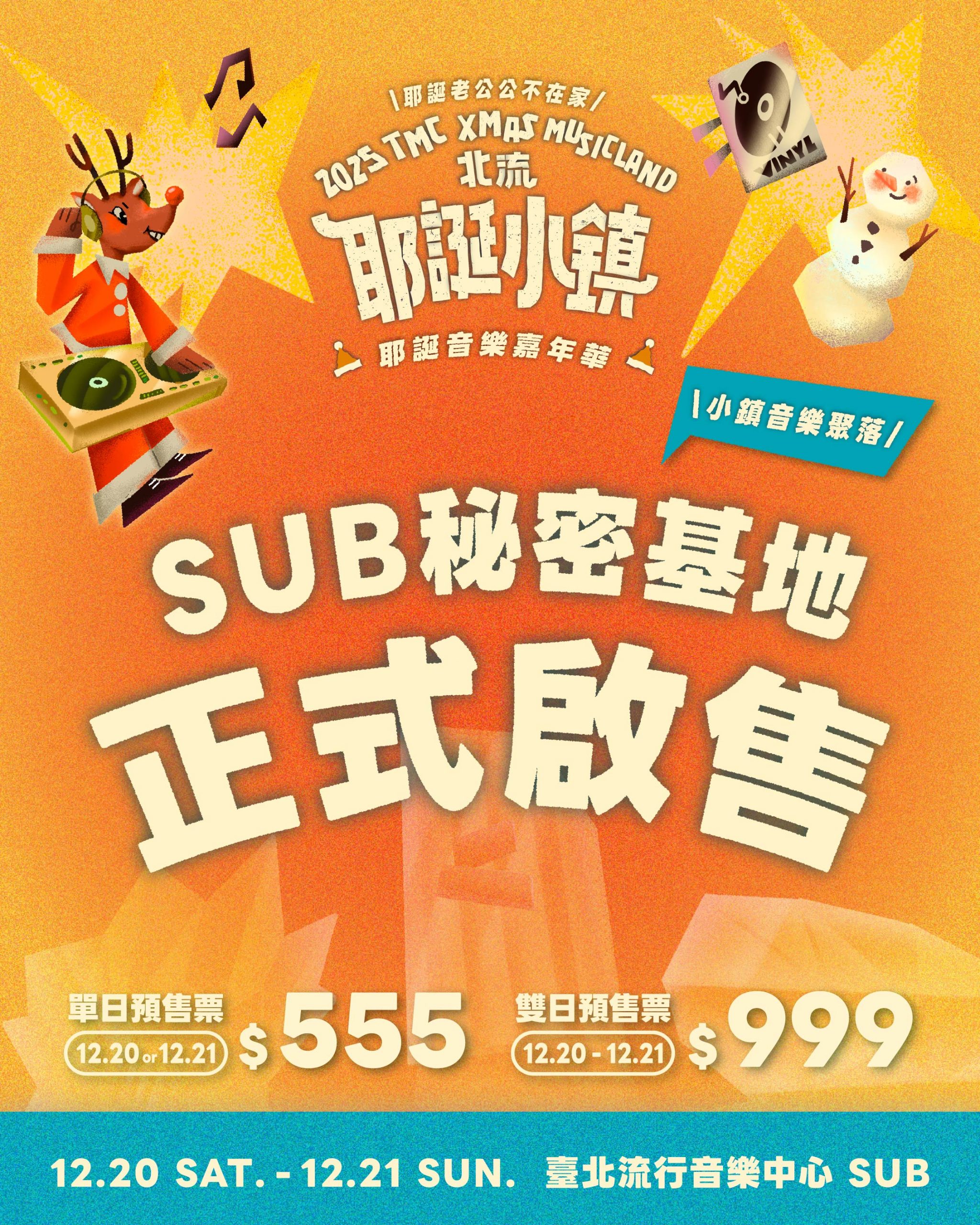 隨著卡司揭曉,2025 北流耶誕小鎮 SUB 舞台正式啟售。12 月 20、21 日登場的「小鎮音樂聚落 at SUB 秘密基地」採單日預售票 555 元、雙日預售票 999 元;12 月 13、14 日的「暖身派對」則採單日票 500 元,詳情請上臺北流行音樂中心官網查詢。