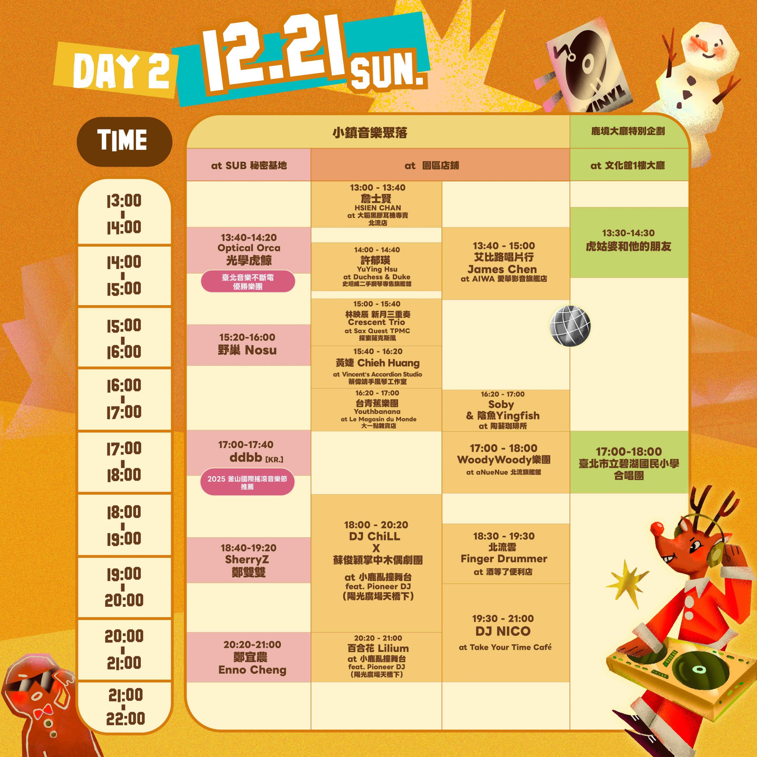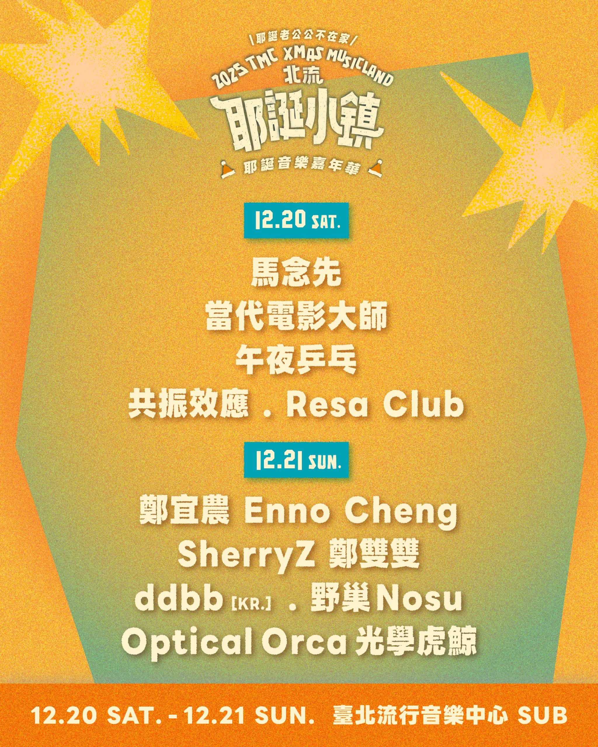 其中的主活動「耶誕音樂嘉年華」將在 SUB 舞台展開兩日限定演出,由 10 組話題卡司接力登場,包括馬念先、午夜乒乓、共振效應、Optical Orca 光學虎鯨、野巢,以及「北流五週年音樂共創計畫」合作亮點鄭宜農與 SherryZ 鄭雙雙等,共同打造跨越爵士、搖滾、電子、獨立流行等多元風格的冬季舞台。