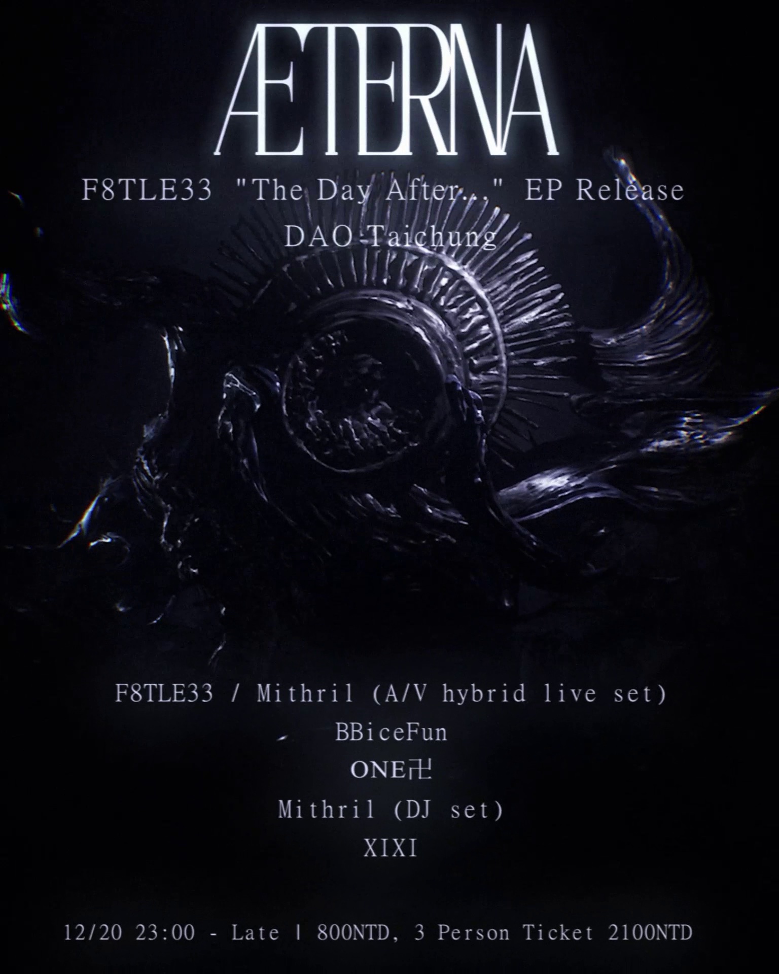 新興實驗派對組織 Æterna 偕台灣解構電子舞曲製作人 F8TLE33、美國多媒體視覺藝術家 Mithril、義大利雕塑家 vvxxii,及眾好友製作人與 DJ。他們將於 12 月 20 日在台中 DAO、12 月 26 日在台北 Final,舉行 F8TLE33 在美國維吉尼亞先鋒廠牌 formforum 新釋出 EP《The Day After…》的發行派對。