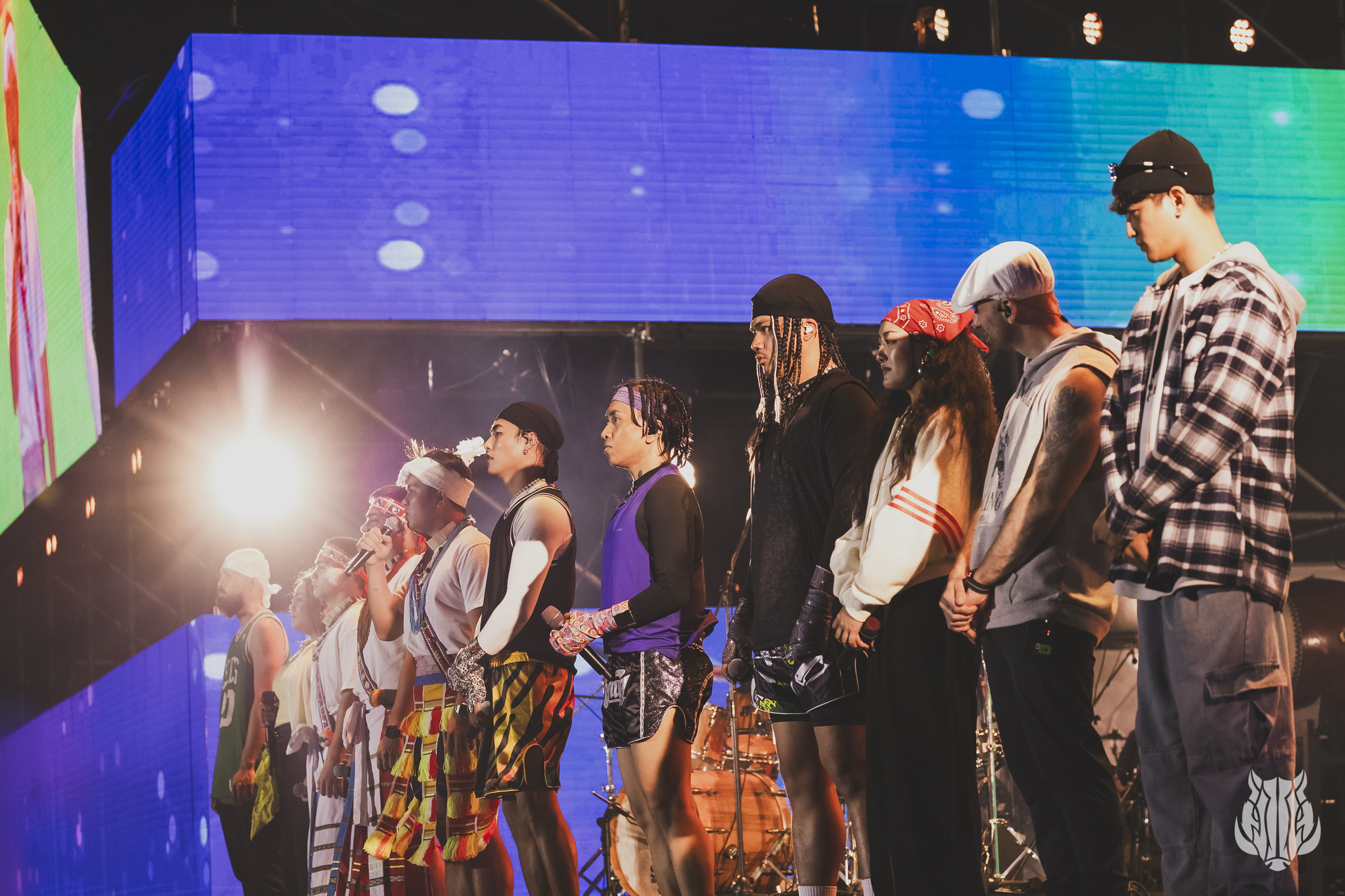 除了姐妹,還有來自廠牌那屋瓦的「貨櫃兄弟」,由 HengJones 大亨和 R.fu 組成的男子饒舌組合,這回搭上甫推出魯凱族語專輯的阿拉斯,合體成為「拉貨櫃」挑起演出大樑,那屋瓦少女隊的曾妮、Kivi 也助陣擔任合聲。表演融合了日系搖滾以及原民饒舌,一路從 R.fu 的〈角度〉、HengJones 大亨的〈酒精.香菸.檳榔〉到阿拉斯的〈像很麗〉,以阿美、撒奇萊雅語、魯凱族語切換碰撞出不同的火花。