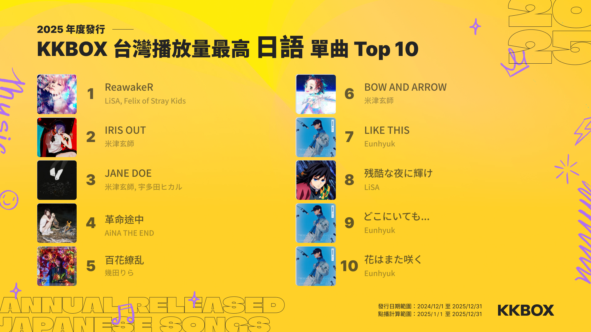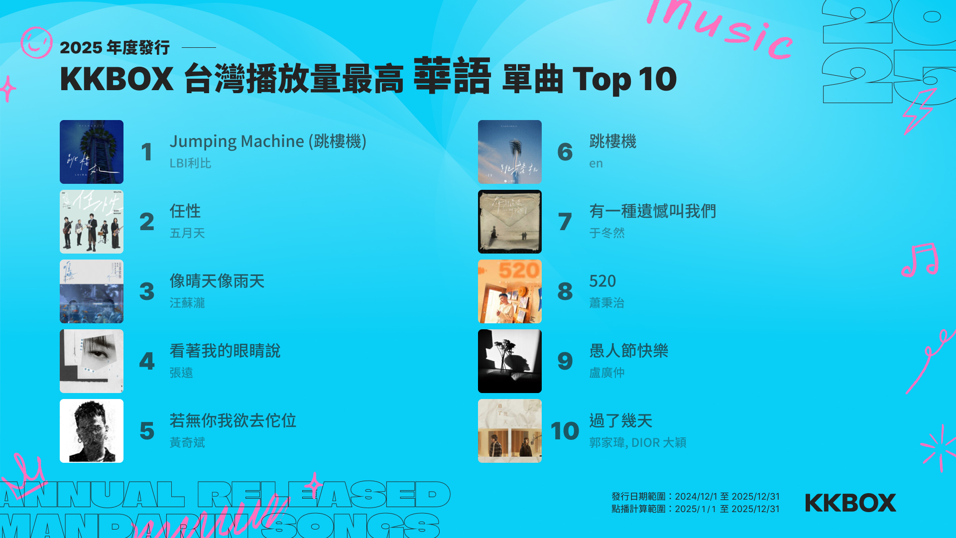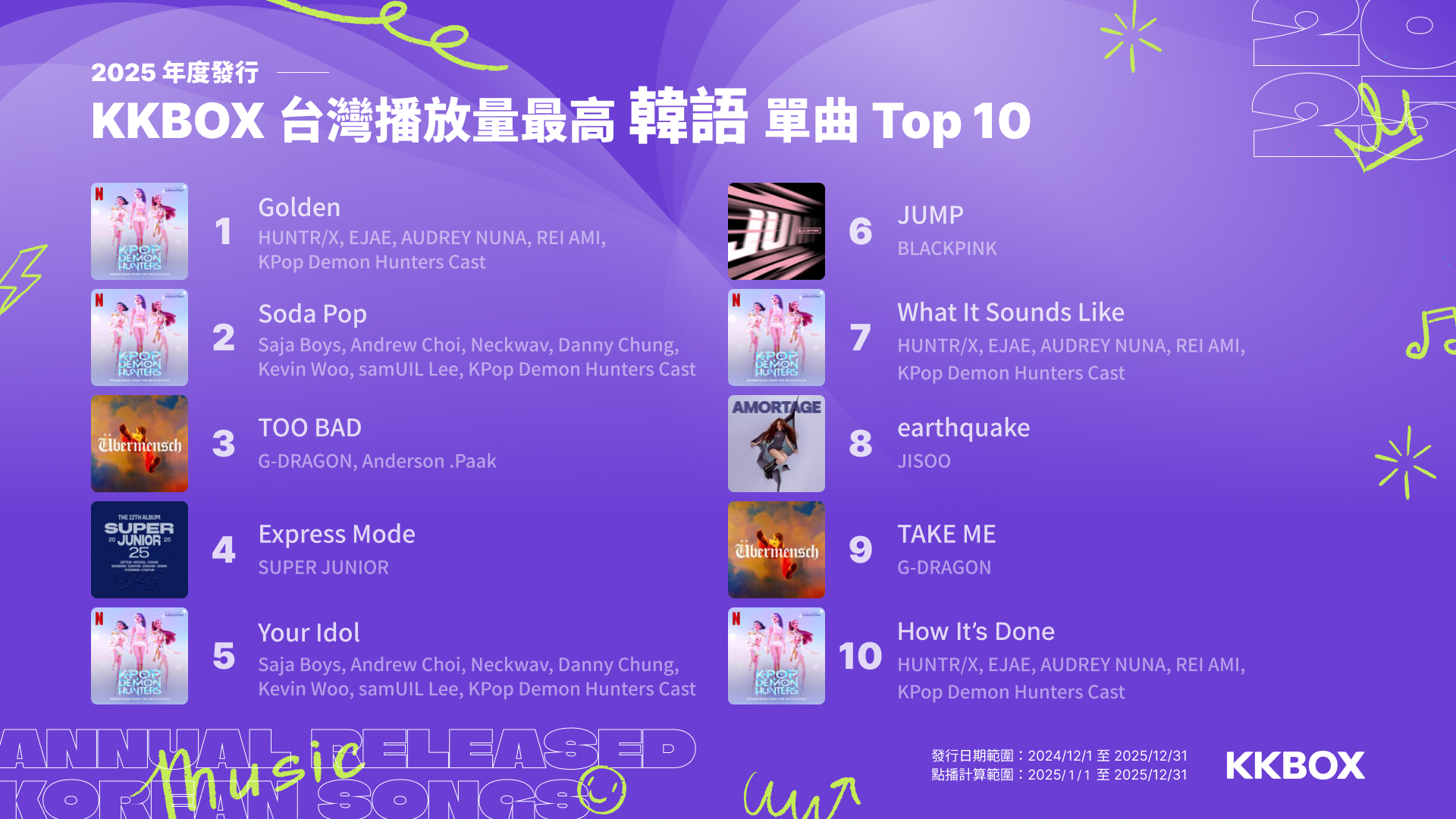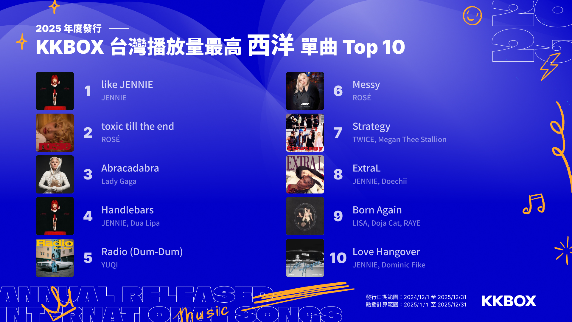 音樂串流平台 KKBOX 公布 2025 年度榜單與音樂趨勢觀察,揭曉全台、華語、西洋、日語、韓語四大語系播放量最高單曲,以及影視合作單曲等榜單內容,盤點過去一年最受歡迎的歌曲與藝人。