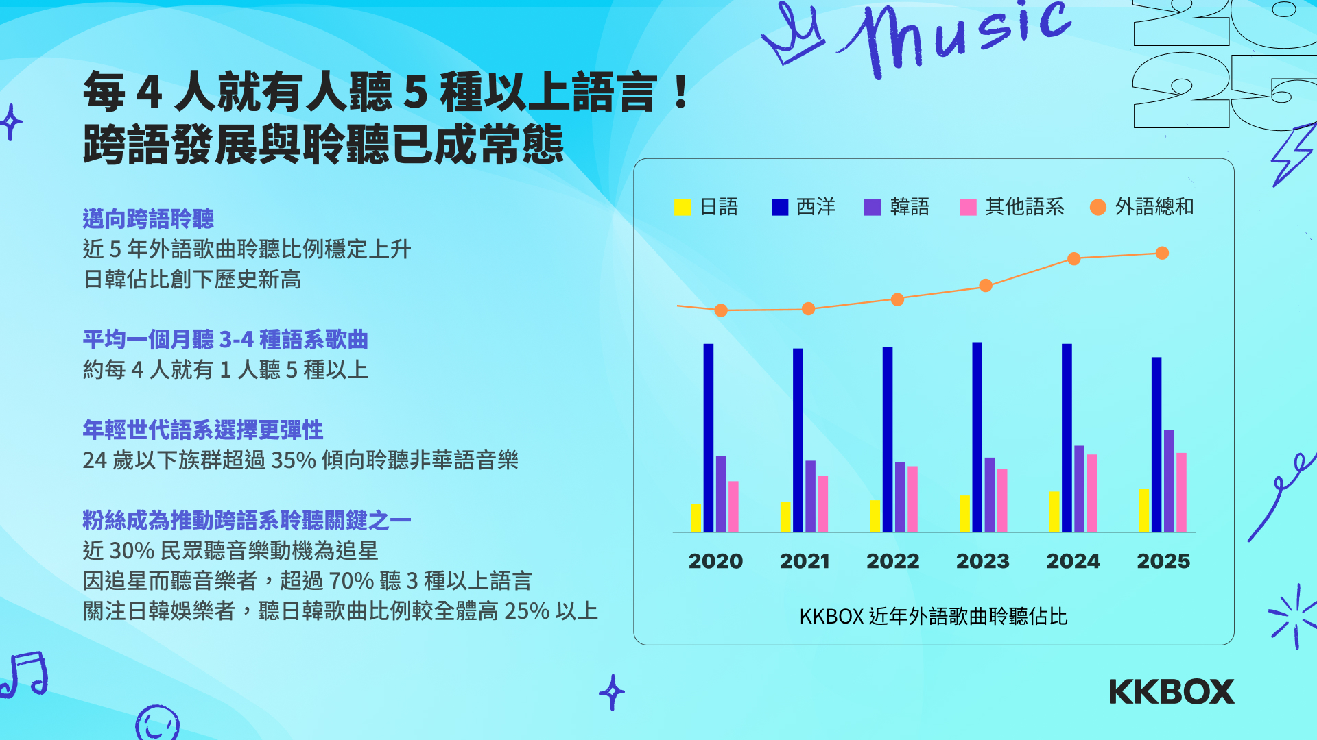 跨語趨勢同樣反應在平台數據上,KKBOX 觀察到近 5 年外語聆聽佔比穩定上升,日語與韓語歌曲聆聽佔比在去年更創下歷史新高。而調查也發現台灣用戶一個月內平均聽 3 到 4 種語系的歌曲,甚至每 4 人就有 1 人聽 5 種以上,此外 24 歲以下年輕族群更有超過 35% 傾向聆聽非華語音樂,顯示跨語聆聽已是普遍現象,而年輕世代在語系選擇上展現更高的切換彈性。