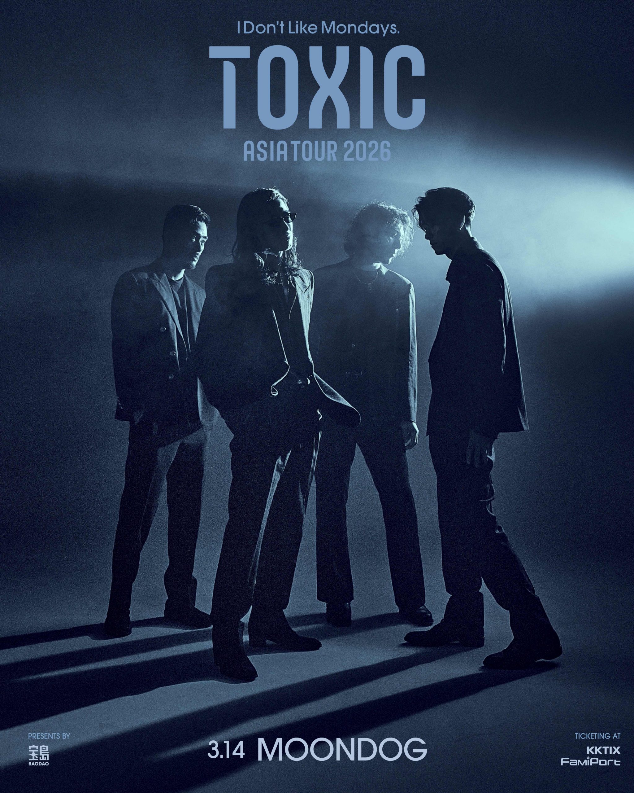 I Don’t Like Mondays. 由主唱悠 、吉他手兆志、貝斯手謙二與鼓手秋氣組成,樂團名稱「I Don’t Like Mondays.」源自對星期一的共同情緒:那個象徵工作、學業與現實壓力的起點。他們希望透過音樂,替每一個被星期一壓得喘不過氣的人,找回身體與情緒的節奏。
