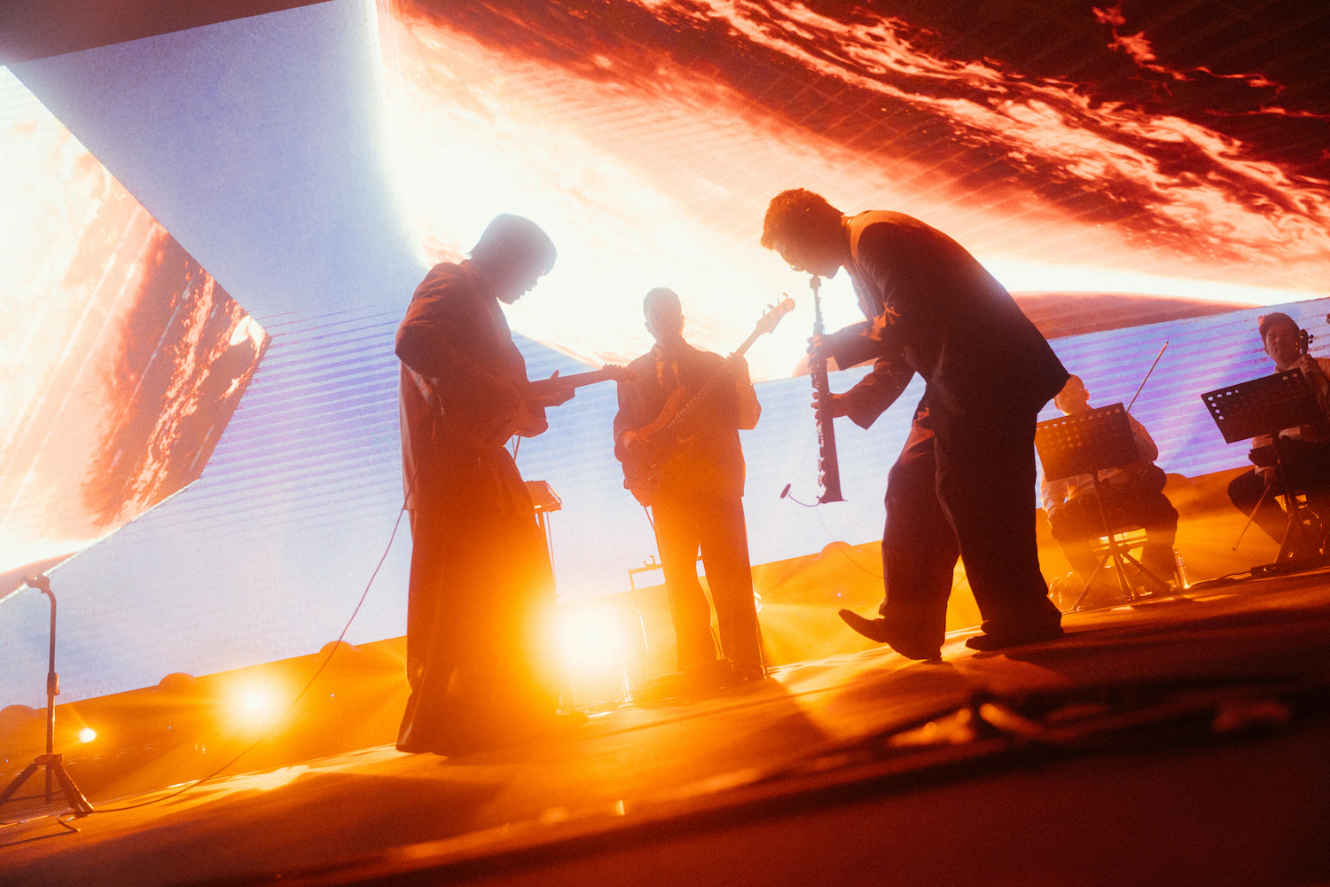 「Alright, let’s surf on the time」唱明了整場演出概念,是乘著飛車穿越時間之浪。第二段〈Mistakes〉到〈Summum Bonum〉動感選曲,配上導播畫面裡的 vaporwave 與錄像藝術濾鏡,讓人以為重返 YMO 時代。國國 talking 自嘲「新北柏林愛樂」後,交給尊龍唱〈Jelly Fish〉、〈Charon’s Gone〉,後者現場版 boom boom 和聲之大,更顯致敬 Lou Reed〈Satellite of Love〉巧思。