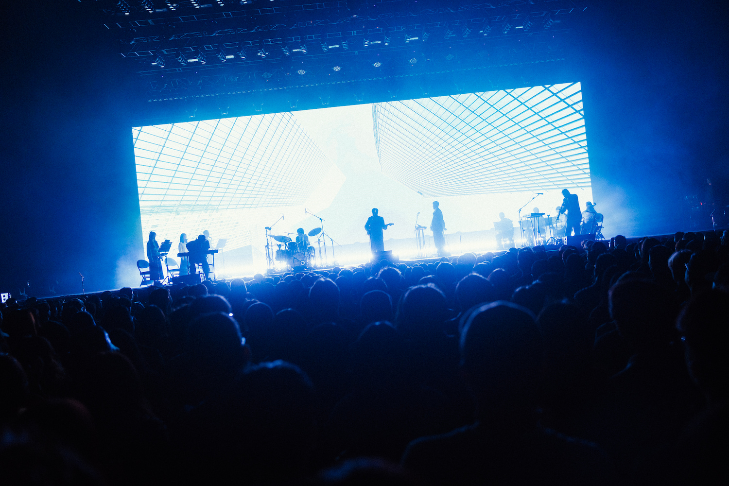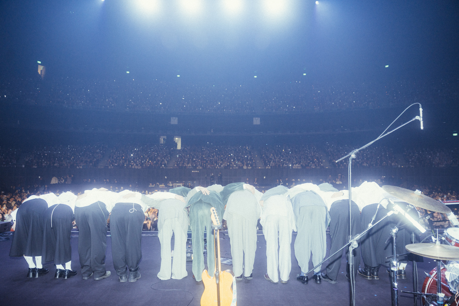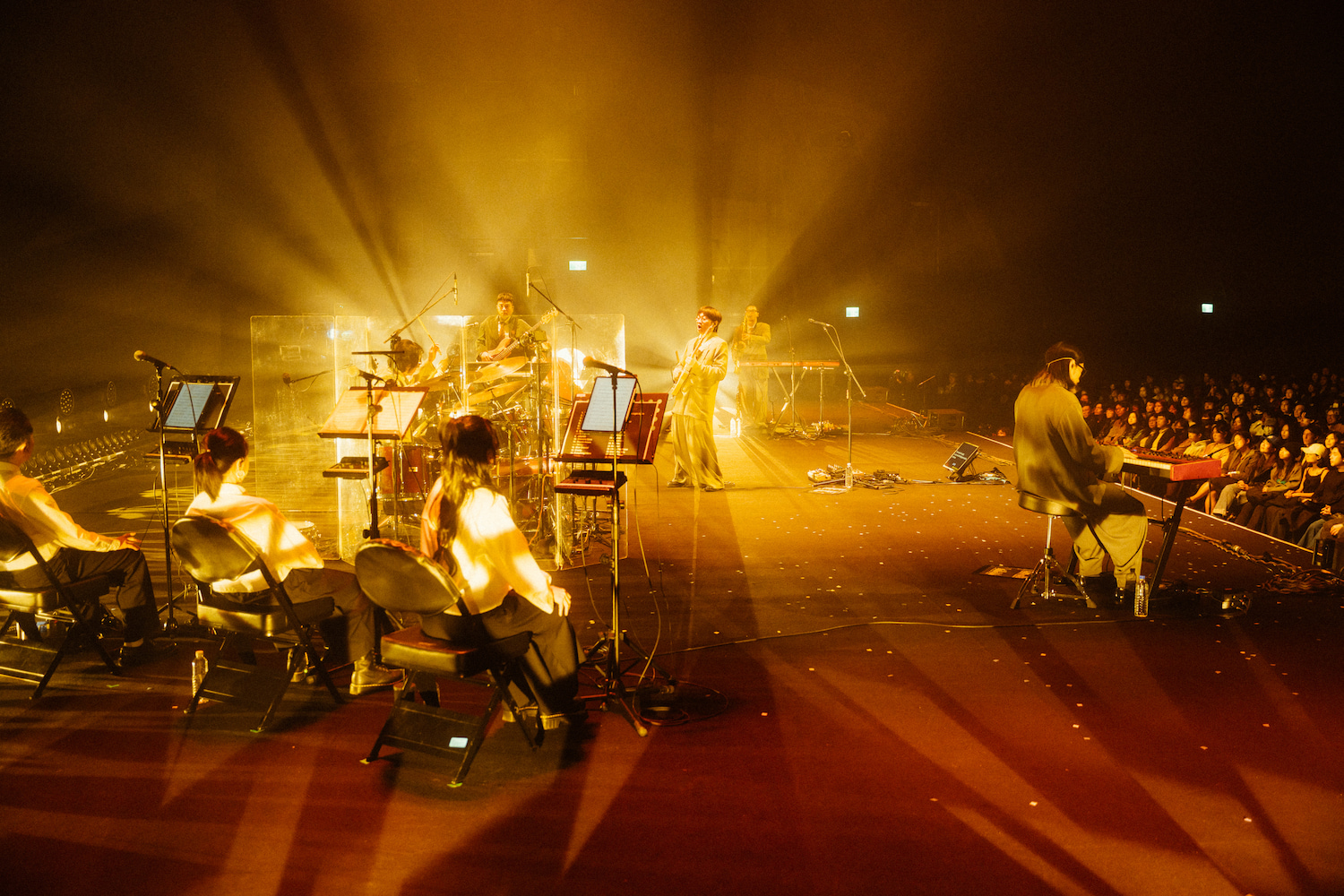 躺著,或抬頭,為了仰望天空,觀眾背都拉直了。北流演唱會宛如兩廳院演奏會,首日開場台下靜悄悄的,僅用掌聲迎接團員上台,摩天樓也悄悄 zoom in 成白色粉粒狀,隨〈Winds of Tomorrow〉啟程第一段〈Teahouse〉、香草度假村、〈Burgundy Red〉調情組曲。