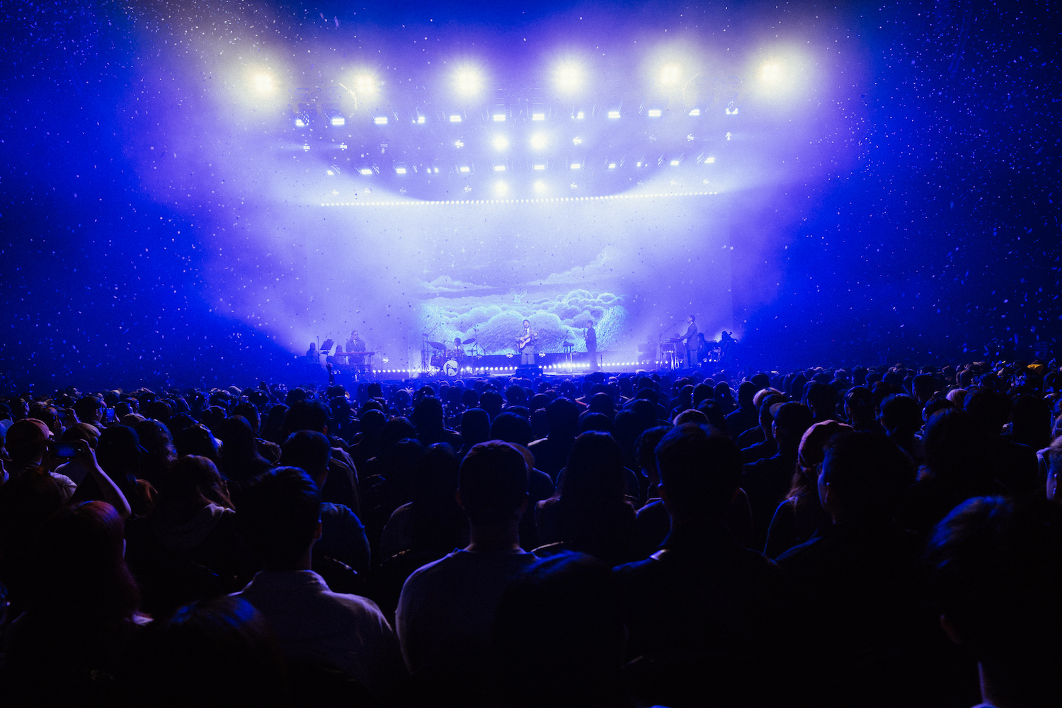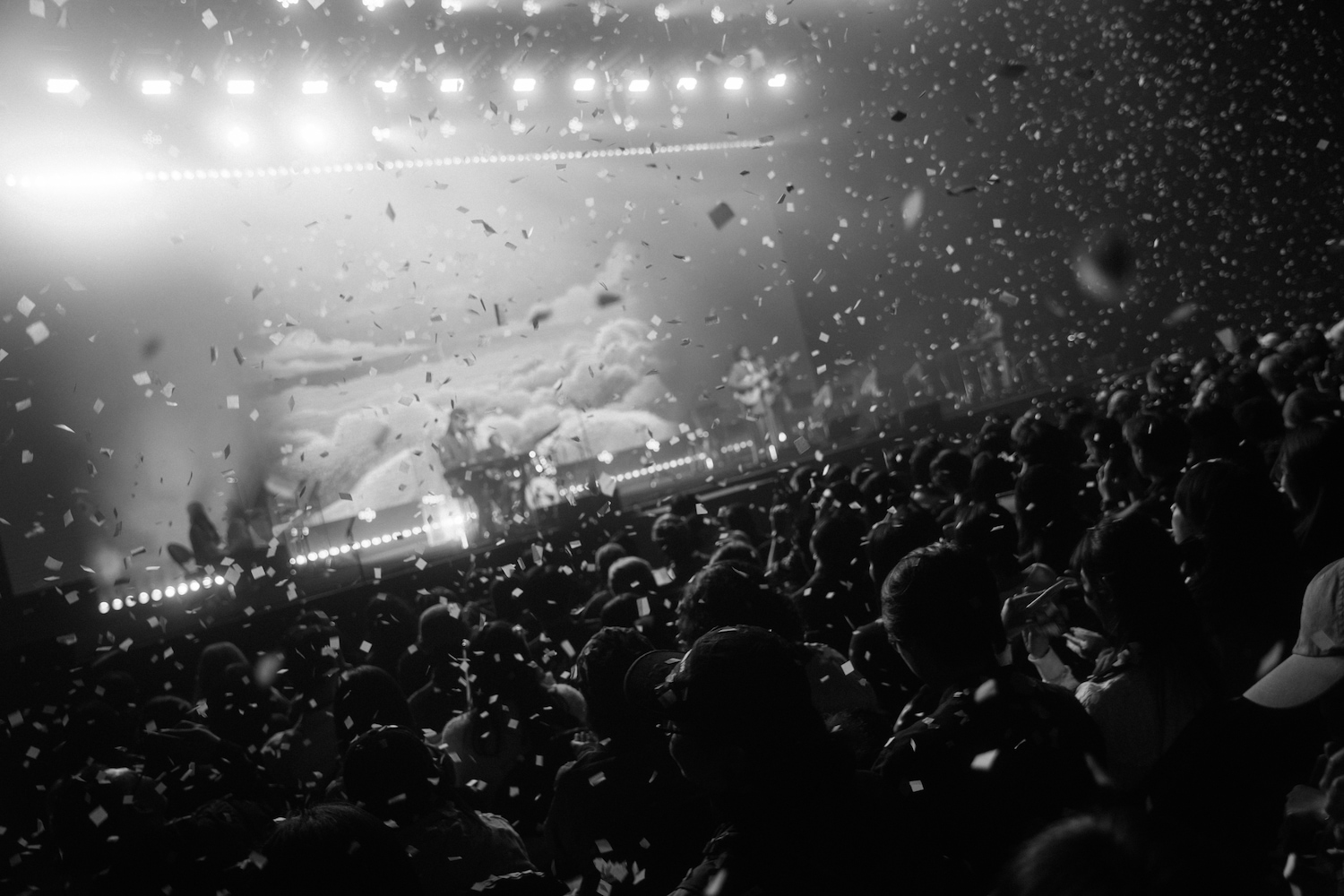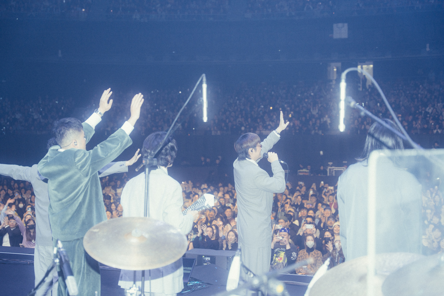 躺著,或抬頭,為了仰望天空,觀眾背都拉直了。北流演唱會宛如兩廳院演奏會,首日開場台下靜悄悄的,僅用掌聲迎接團員上台,摩天樓也悄悄 zoom in 成白色粉粒狀,隨〈Winds of Tomorrow〉啟程第一段〈Teahouse〉、香草度假村、〈Burgundy Red〉調情組曲。