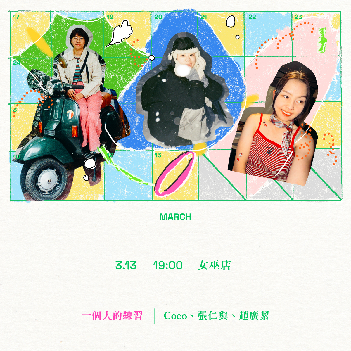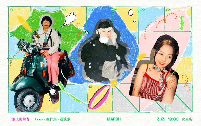 三位來自不同樂團與背景的女性創作人——緩緩 Huan Huan 主唱 Coco、張仁與、Blueburn 主唱趙廣絜,公布將於 3 月 13 日在女巫店舉行共同演出《一個人的練習|Coco、張仁與、趙廣絜》。