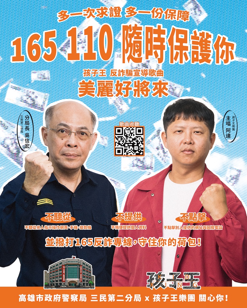 為因應年節的詐騙高風險期,孩子王創作〈美麗好將來〉歌曲,並協同三民第二分局將宣導標語以趣味的口氣放入歌曲中,分局長吳信宏及分局同仁也共同入鏡拍攝,並一起高呼「165 110 隨時保護你」,充分展現警民合作的決心。