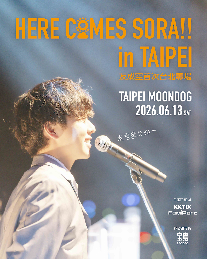 《Here Comes SORA!! in Taipei》將於今年 6 月在台北 MOONDOG 登場,已自學中文許久的他也特別向台灣樂迷喊話:「我非常期待在台北見到大家!我會全心全意地為你們演唱。」