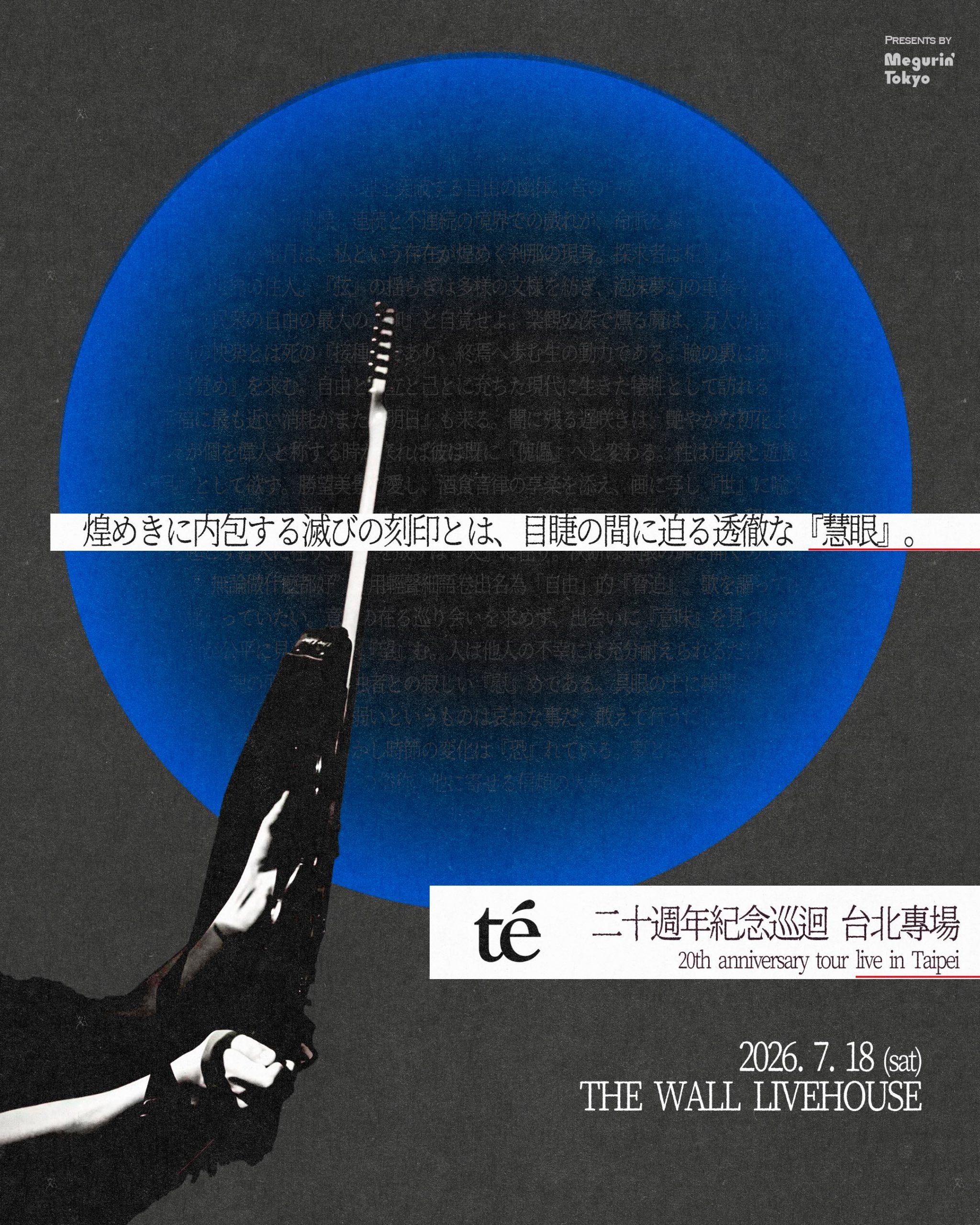曾在第二屆大港開唱留下震撼身影、多次來台演出的日本指標性後搖滾樂團 te’,在成軍 20 週年之際,終於正式公佈了樂迷引頸期盼的台灣專場。這是 te’ 睽違 9 年再度來到台灣,將於 7 月 18 日在台北 THE WALL LIVEHOUSE 舉辦紀念專場「te’ 二十週年紀念巡迴台北專場 – 煌めきに内包する滅びの刻印とは、目睫の間に迫る透徹な『慧眼』」。